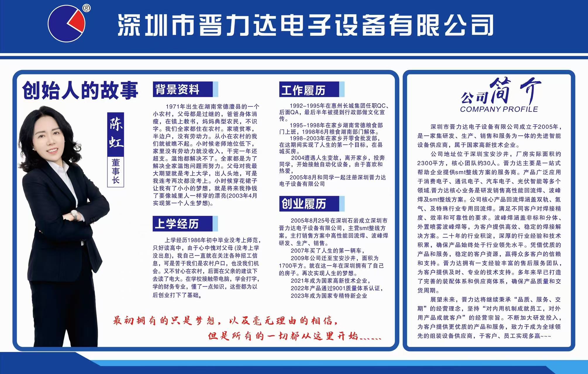 深圳市晉力達電子設(shè)備有限公司成立于2005年,主要從事高性能環(huán)保無鉛回流焊、無鉛波峰焊SMT等周邊設(shè)備的研制開發(fā)、生產(chǎn)銷售為一體的專業(yè)流水線配套生產(chǎn)設(shè)備企業(yè)。優(yōu)良的產(chǎn)品質(zhì)量和 先進的技術(shù)使我們與客戶們建立了良好的關(guān)系,并讓我們在同行業(yè)中擁有良好的聲譽。遵循“誠信、務(wù)實、精益、創(chuàng)新、環(huán)?!钡钠髽I(yè)文化,堅持以技術(shù)差異化創(chuàng)造 市場機會,秉承以高技術(shù)、高品質(zhì)、優(yōu)服務(wù)為宗旨,堅持國際化、標(biāo)準(zhǔn)化、專業(yè)化的方針,我們將為您提供優(yōu)質(zhì)的設(shè)備和優(yōu)良的服務(wù)。我們倡導(dǎo)誠信變通、簡單、高 效、樂觀敬業(yè)的激情創(chuàng)業(yè)文化,我們致力于用技術(shù)為客戶提供更好的體驗和服務(wù),與客戶員工共同成長,實現(xiàn)多贏!