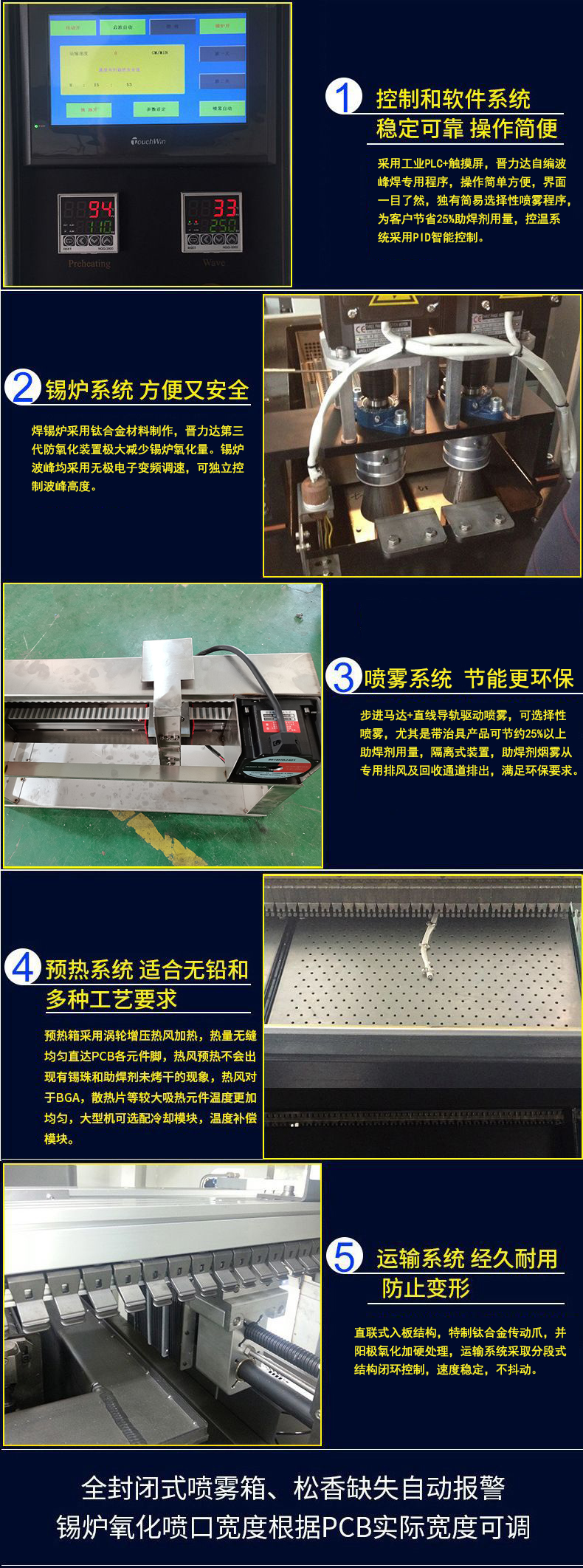 1、智能檢測系統(tǒng),PCB板進入助焊劑噴霧區(qū)和錫爐焊接區(qū),自動開始噴霧和焊接,完畢后自動停止,為客戶減少25%電能和助焊劑,錫條的用量