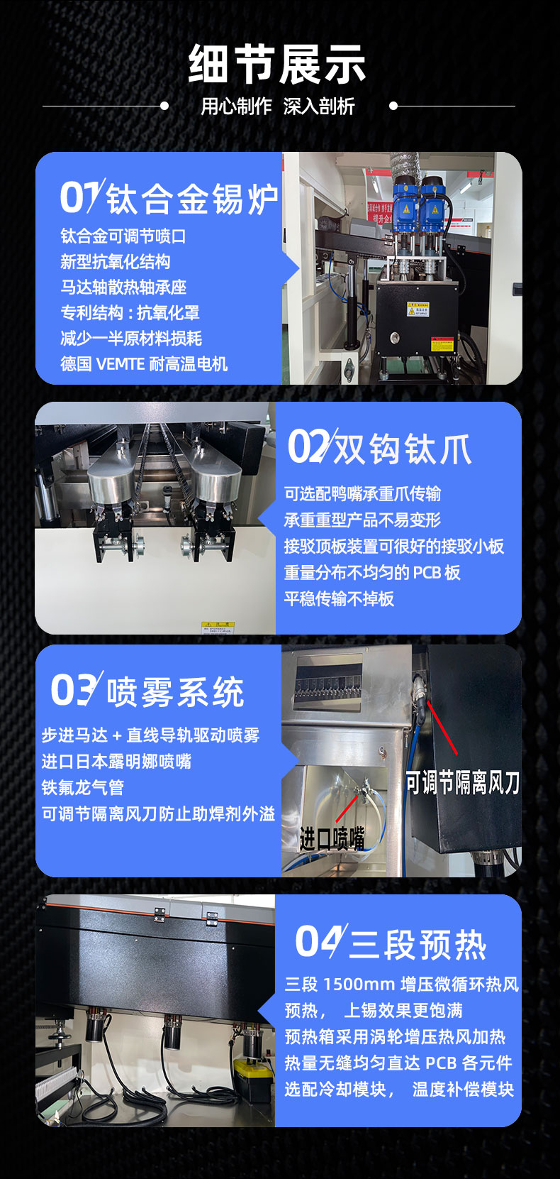 ● 自動(dòng)定位噴霧和噴錫,步進(jìn)電機(jī)驅(qū)動(dòng)噴霧,可調(diào)節(jié)式噴錫口設(shè)計(jì),同比減少25%電量和輔料的消耗