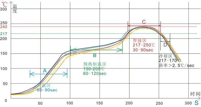 保溫階段,主要目的是使回流焊爐膛內(nèi)PCB板及各元器件的溫度穩(wěn)定,使元件溫度保持一致。