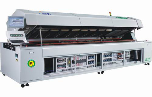 爐溫的設(shè)置,一般應(yīng)先確定一個(gè)爐子鏈條的傳送信息速度,其后才開(kāi)始發(fā)展進(jìn)行工作溫度的設(shè)定。鏈速慢、爐溫可低點(diǎn),因?yàn)檩^長(zhǎng)的時(shí)間也可達(dá)到熱平衡;反之,可提高爐溫如果PCB上元器件密、大元器件多,要達(dá)到熱平衡,需要較多熱量,這就要求提高爐溫;相反,則要求降低爐溫。應(yīng)該強(qiáng)調(diào)的是,鏈條調(diào)速范圍一般不大,因?yàn)榇_定了回流焊爐的焊接工藝時(shí)間和溫度區(qū)總長(zhǎng)度,除非回流焊爐的溫度區(qū)相對(duì)較大和較長(zhǎng),否則生產(chǎn)能力是相當(dāng)充足的。