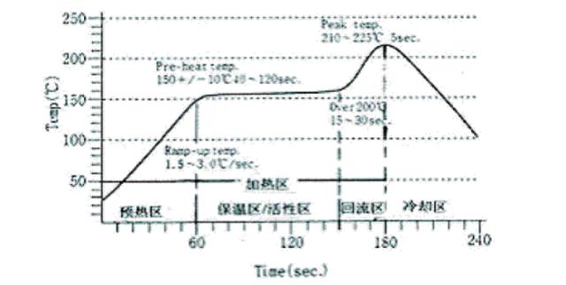 圖 1 是中溫錫膏( Sn63 / Sn62 )理想的紅外回流溫度曲線,它反映了 SMA 通過(guò)回流爐時(shí), PCB 上某一點(diǎn)的溫度隨時(shí)間變化的曲線,它能直觀反映出該點(diǎn)在整個(gè)焊接過(guò)程中的溫度變化,為獲得最佳焊接效果提供了科學(xué)的依據(jù),從事 SMT焊接的工程技術(shù)人員,應(yīng)對(duì)理想的溫度曲線有一個(gè)基本的認(rèn)識(shí),該曲線由四個(gè)區(qū)間組成,即預(yù)熱區(qū)、保溫區(qū)/活性區(qū)、回流區(qū)、冷卻區(qū),前三個(gè)階段為加熱區(qū),最后一階段為冷卻區(qū),大部分焊錫膏都能用這四個(gè)溫區(qū)成功實(shí)現(xiàn)回流焊。故紅外回流爐均設(shè)有 4 - 5 個(gè)溫度,以適應(yīng)焊接的需要。