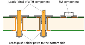 在把錫膏順利印刷到鍍通孔后,自動(dòng)放置機(jī)會(huì)拾取通孔插裝元件插入通孔中。通孔元件的引腳撕裂鍍通孔中的錫膏,并將一部分錫膏膏推到底部。底部的錫膏在回流熔融時(shí)會(huì)通過毛細(xì)作用流回鍍通孔中,從而完全填充鍍通孔內(nèi)部。