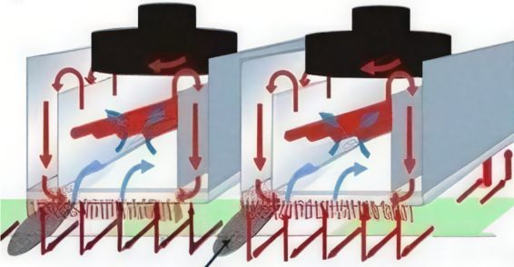 風葉熱風加熱結(jié)構(gòu)的穿透力不足,而風輪增壓式熱風結(jié)構(gòu)正是為解決這個問題誕生的,回流焊增壓熱風結(jié)構(gòu)的核心原理是通過強制高壓氣流穿透高元件陰影區(qū),解決傳統(tǒng)熱風爐的熱傳遞不均勻問題。