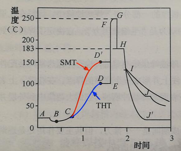 當(dāng)焊接操作開始,操作者將室溫PCBA通過助焊劑涂覆區(qū)時(shí),印制板的溫度接近于助焊劑的液溫,即圖中B點(diǎn)。涂覆了助焊劑的PCB從C點(diǎn)開始進(jìn)入預(yù)熱區(qū),受熱后助焊劑中的溶劑不斷被蒸發(fā),而助焊劑中的固體成分開始分解出能凈化基體金屬的活性物質(zhì),在PCB到達(dá)D點(diǎn)時(shí),達(dá)到預(yù)熱所要求的溫度,這是一般的通孔安裝PCBA預(yù)熱溫度曲線。對于 SMC/SMD的大量應(yīng)用的PCBA,由于PCB基板材質(zhì)、厚度、層數(shù)、銅箔黏合劑等因素,決定其熱容量的提高,預(yù)熱溫度也隨之提高。預(yù)熱溫度被普遍提高到與焊接溫度的差值小于100℃以內(nèi)的程度,如圖中紅色曲線所示的D'點(diǎn)(150℃左右)。