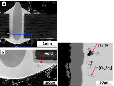 所有通孔內(nèi)的電阻器引腳均被無鉛SAC305焊料完整包裹。經(jīng)過SEM觀察后發(fā)現(xiàn)電阻器J1的焊點幾乎沒有空洞,意味著焊點的強度保持良好。銅表面和焊料之間形成了致密的IMC層(Cu,Ni)6Sn5,且厚度均在2.5-3.5μm的范圍。集成電路K1-K3在焊后可靠性也可接受,銅表面同樣形成了(Cu,Ni)6Sn5層。