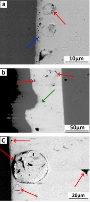 圖2. 電阻器J1 (a, b)和J3 (右) 的焊點SEM圖。