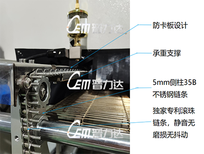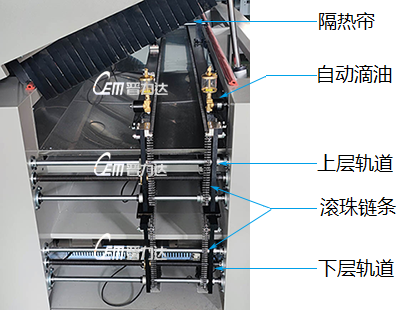●獨(dú)家雙層式承重鏈條結(jié)構(gòu),上層固化,下層治具回流至產(chǎn)線前段