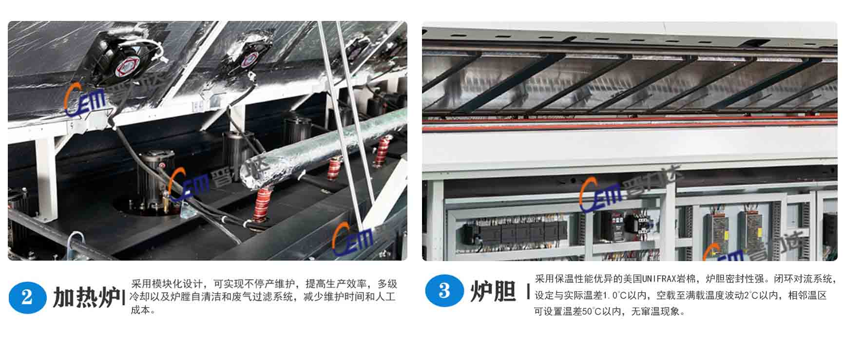 ●全程氮氣定量可控,配置靜氧監(jiān)測和控制系統(tǒng),N2低至12m3/min,各溫區(qū)通過能量優(yōu)化的電機獨立閉環(huán)控制,爐內殘氧含量低至800-2500ppm,具有最低 CO2 的節(jié)能系統(tǒng)